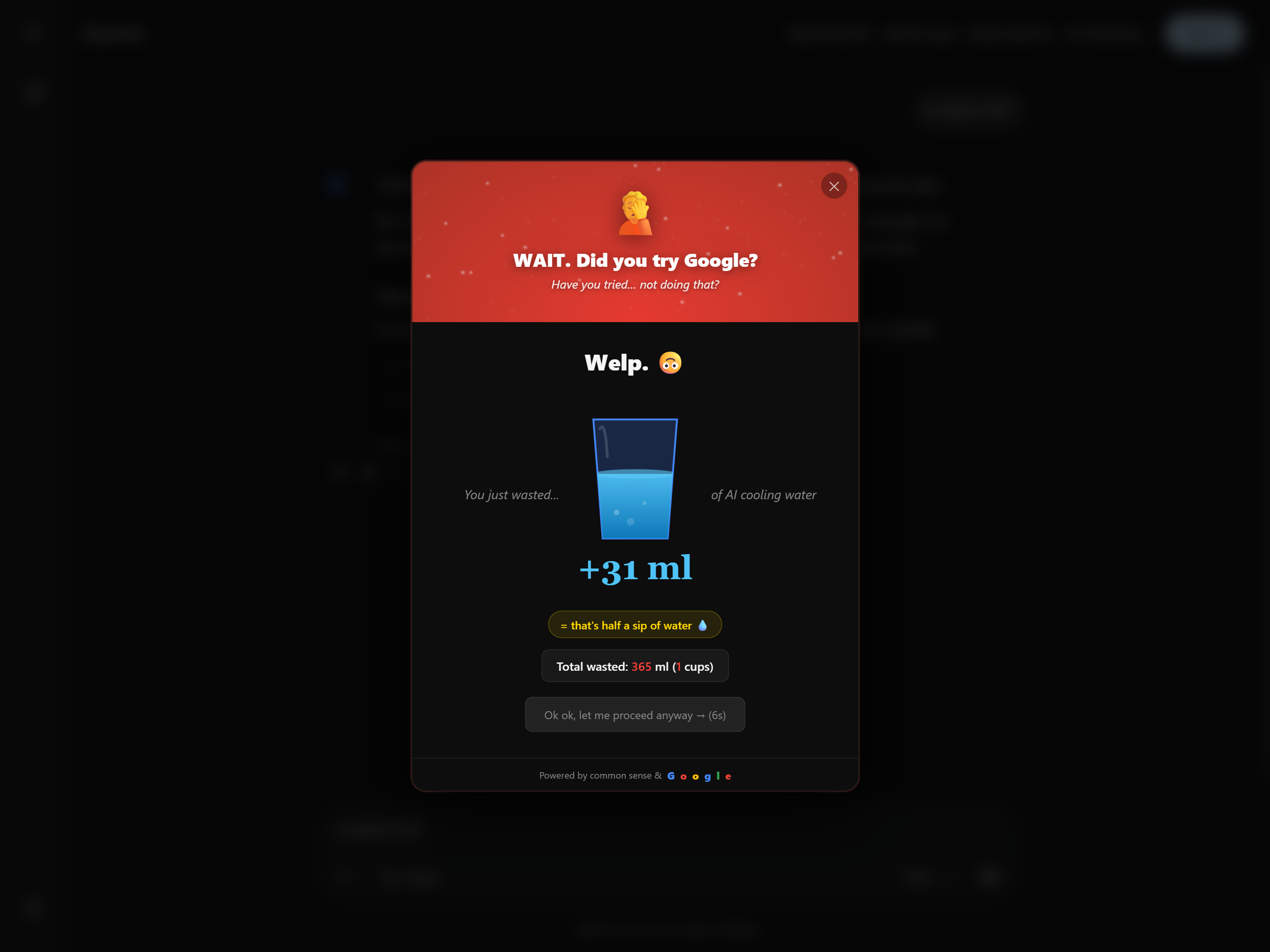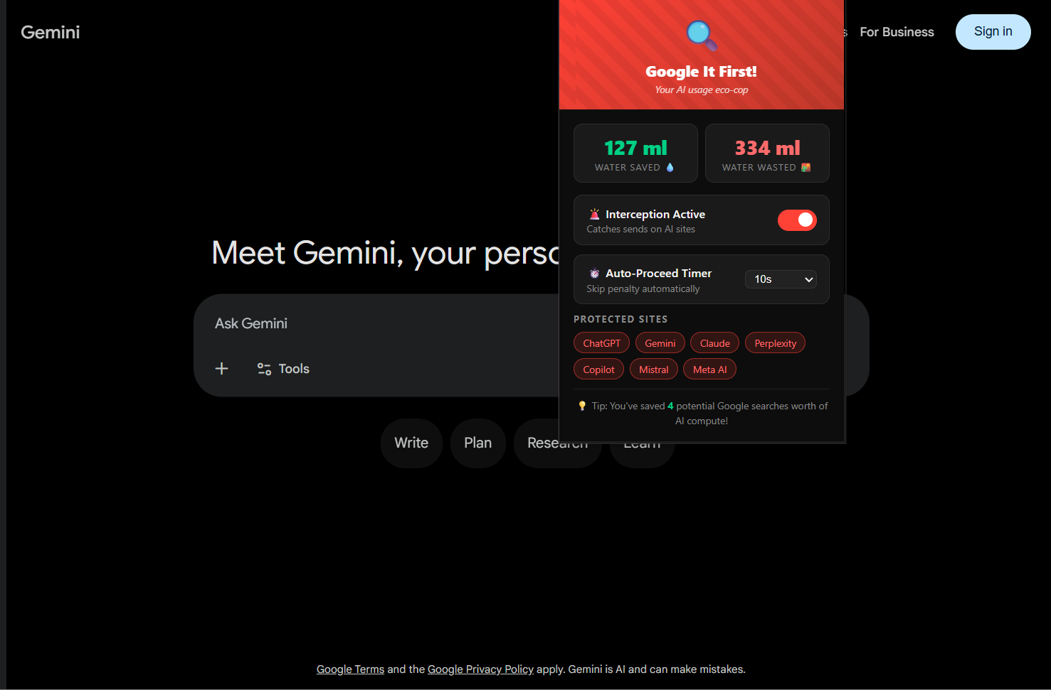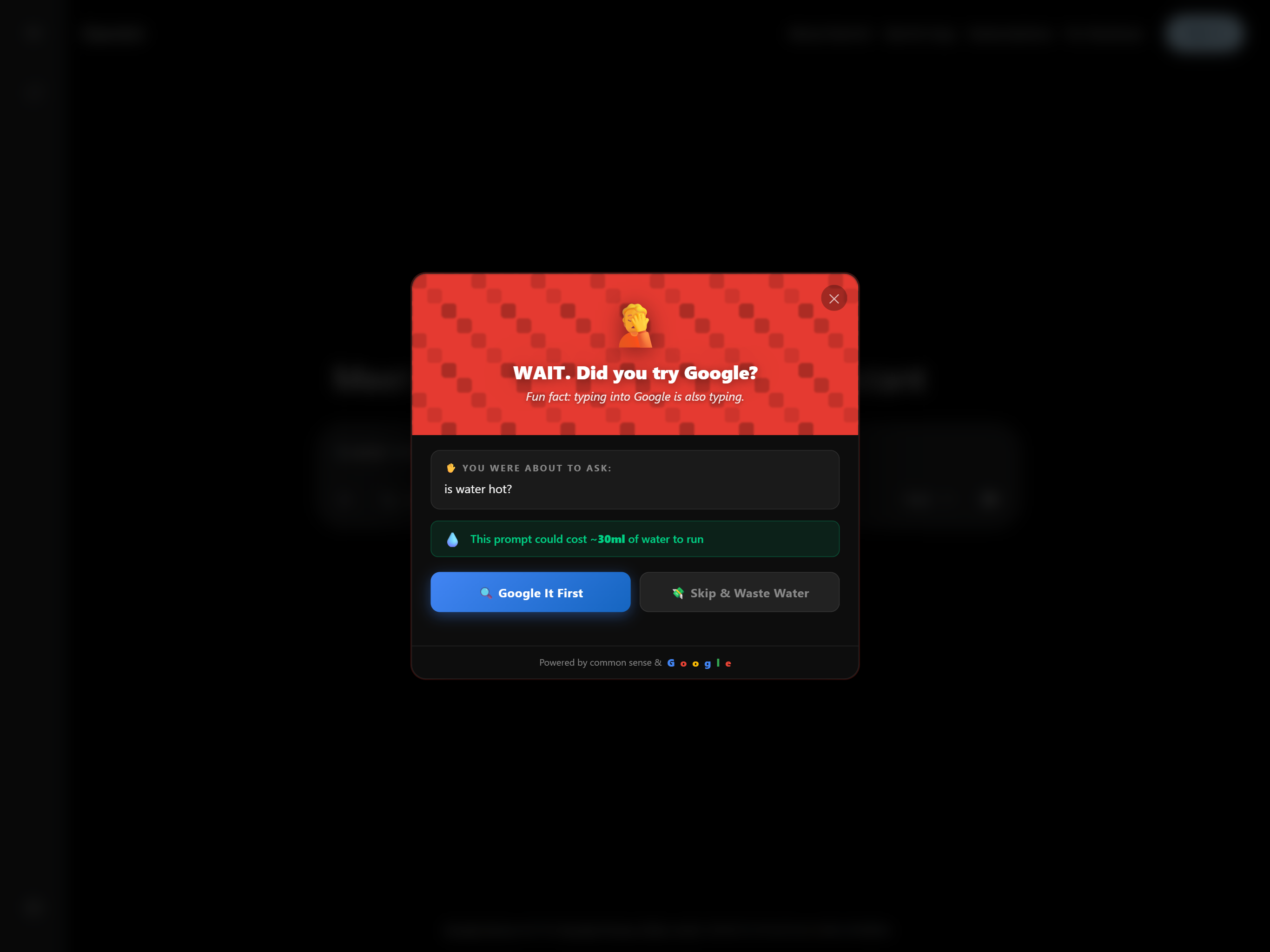 Google It First! is an eco-friendly Chrome Extension built for Earth Day 2026 to reduce the massive water footprint left by unnecessary LLM queries. It actively monitors major AI platforms (ChatGPT, Gemini, Claude, etc.) and intercepts user prompts. Using a local NLP model, it classifies whether a query requires an LLM or can be answered via a traditional search. If a search is sufficient, it displays an interactive overlay with inline DuckDuckGo results, saving data center cooling water. It also features a tracking dashboard and fun "guilt-trip" penalty animations for bypassing.