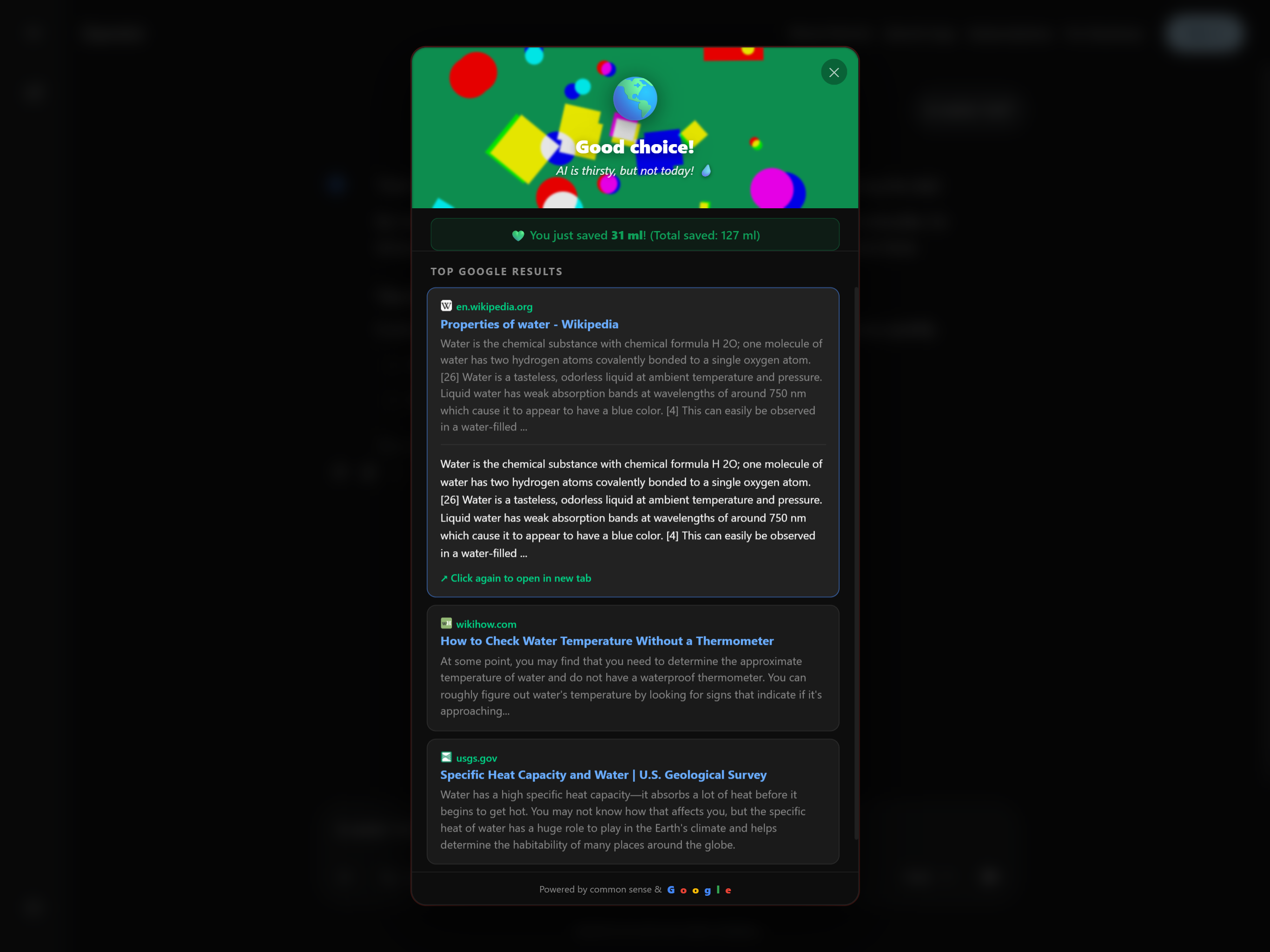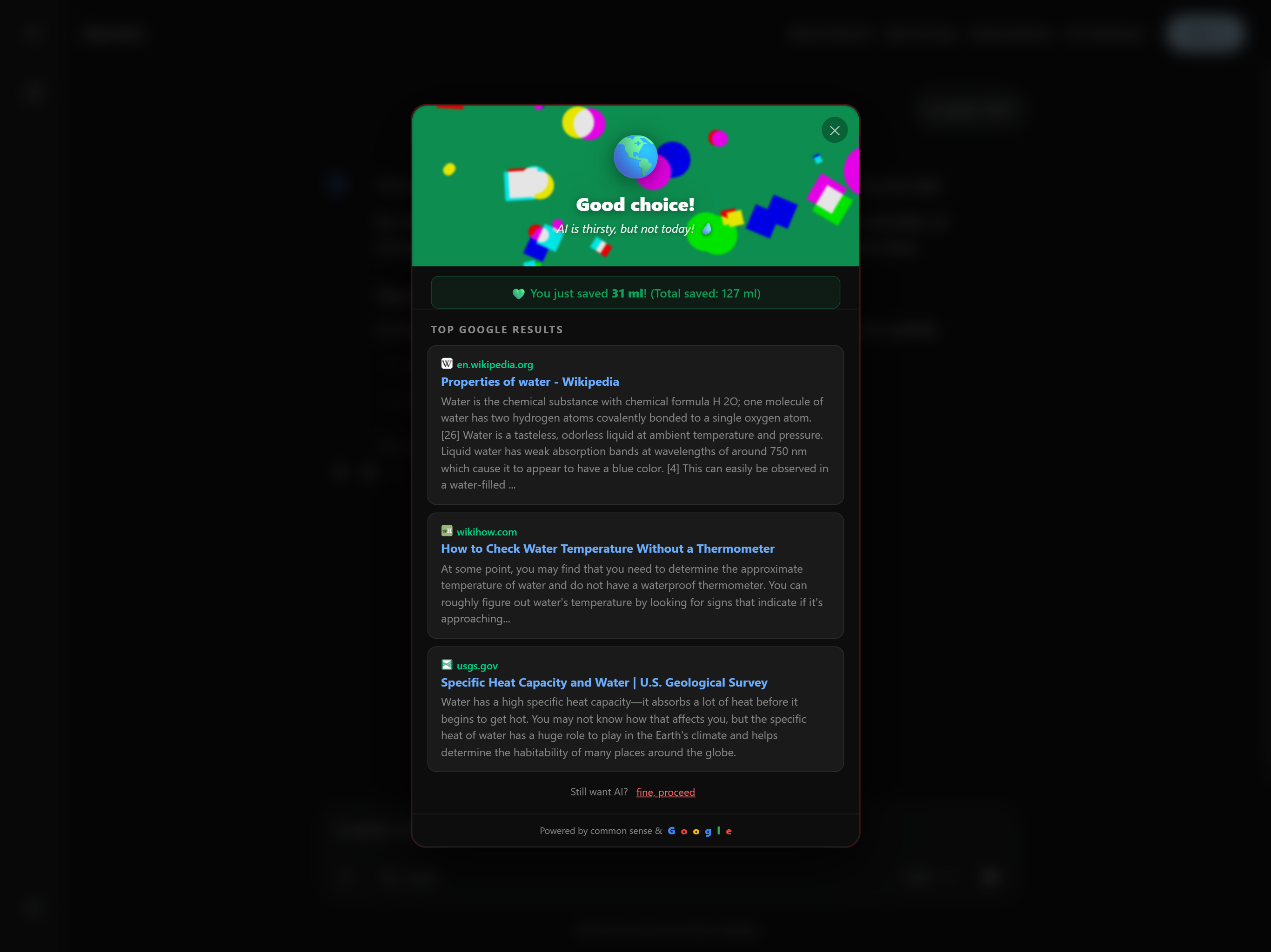 - Building the prompt interception overlay with interactive water-wasting penalty animations and inline DuckDuckGo search results bridging.